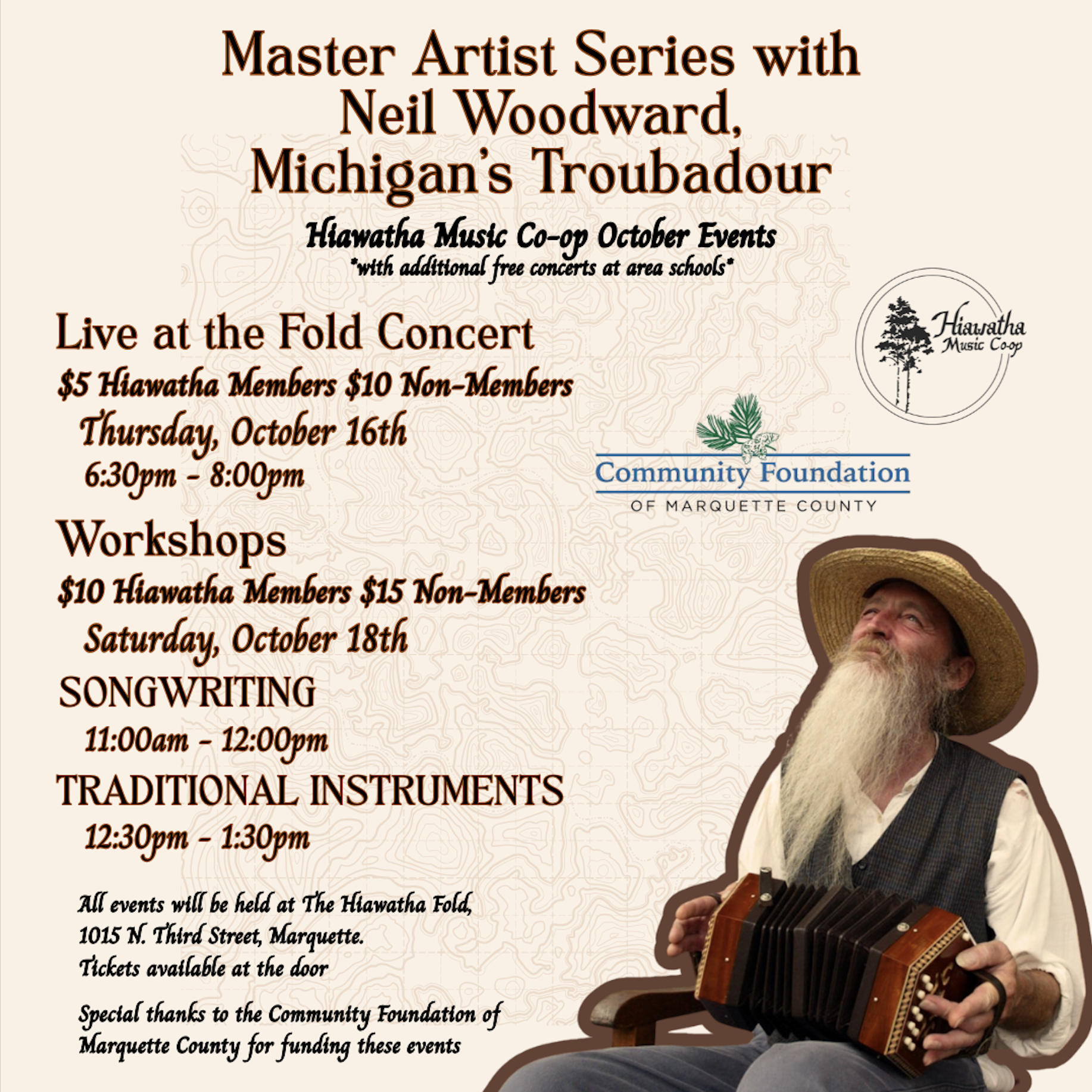Join us at the Hiawatha Fold on Thursday, October 16th, from 6:30 pm – 8:00 pm for a Live at the Fold concert: Master Artist Series with Neil Woodward, Michigan’s Troubadour! Tickets are $5 for Hiawatha Members and $10 for Non-Members.