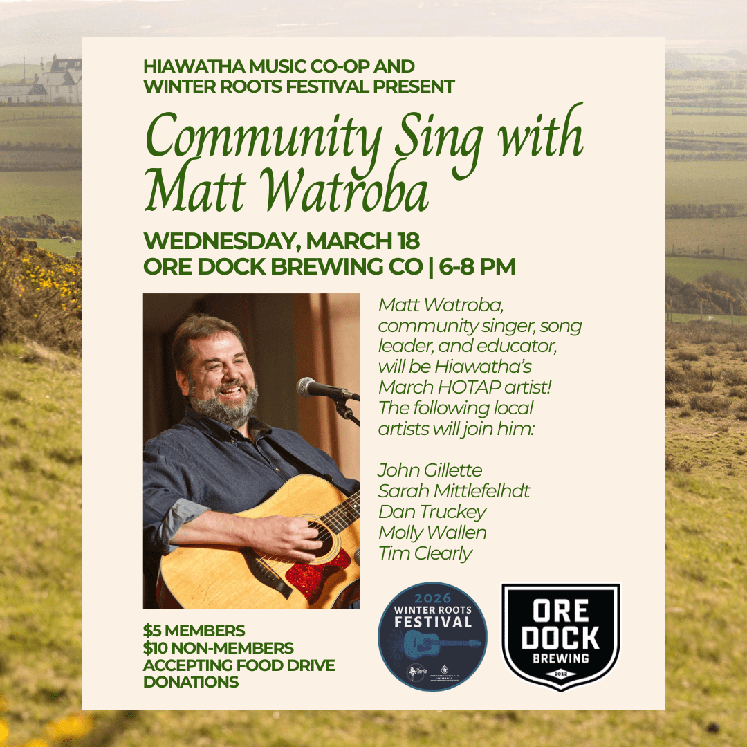 As our first concert of Winter Roots Festival 2026, we are thrilled to announce Matt Watroba as our March 18th HOTAP guest artist. He will be leading a Community Sing, where other guest artists will join him in song and celebration. Some of whom include: John Gillette, Sarah Mittlefelhdt, Dan Truckey, Molly Wallen, & Tim Clearly.